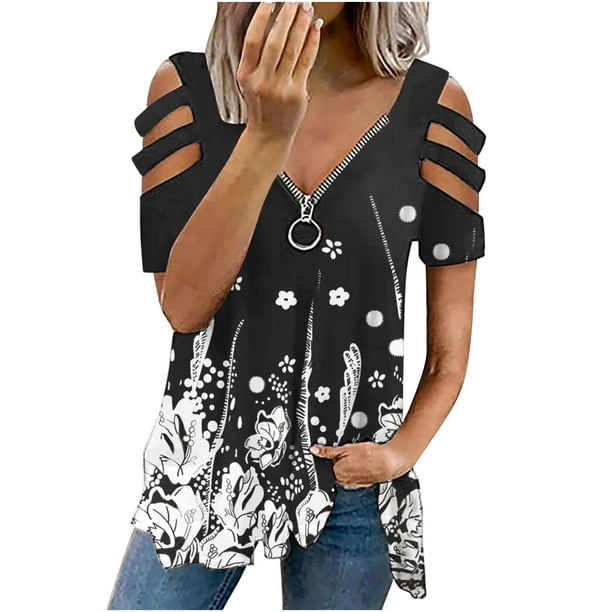 Womens Printed Top Zipper V Neck Off Shoulder Short Sleeve T Shirt Blouse Top Walmart Com